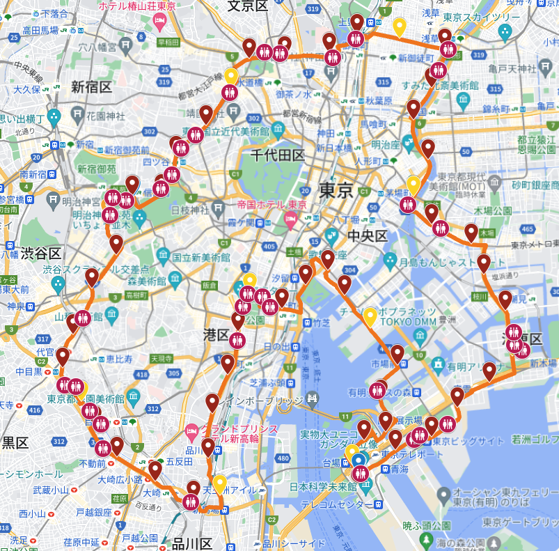 浅草、上野、神宮外苑、国立競技場、目黒川、東京タワー、豊洲大橋を渡り豊洲市場、そしてゴールお台場に帰ってくる