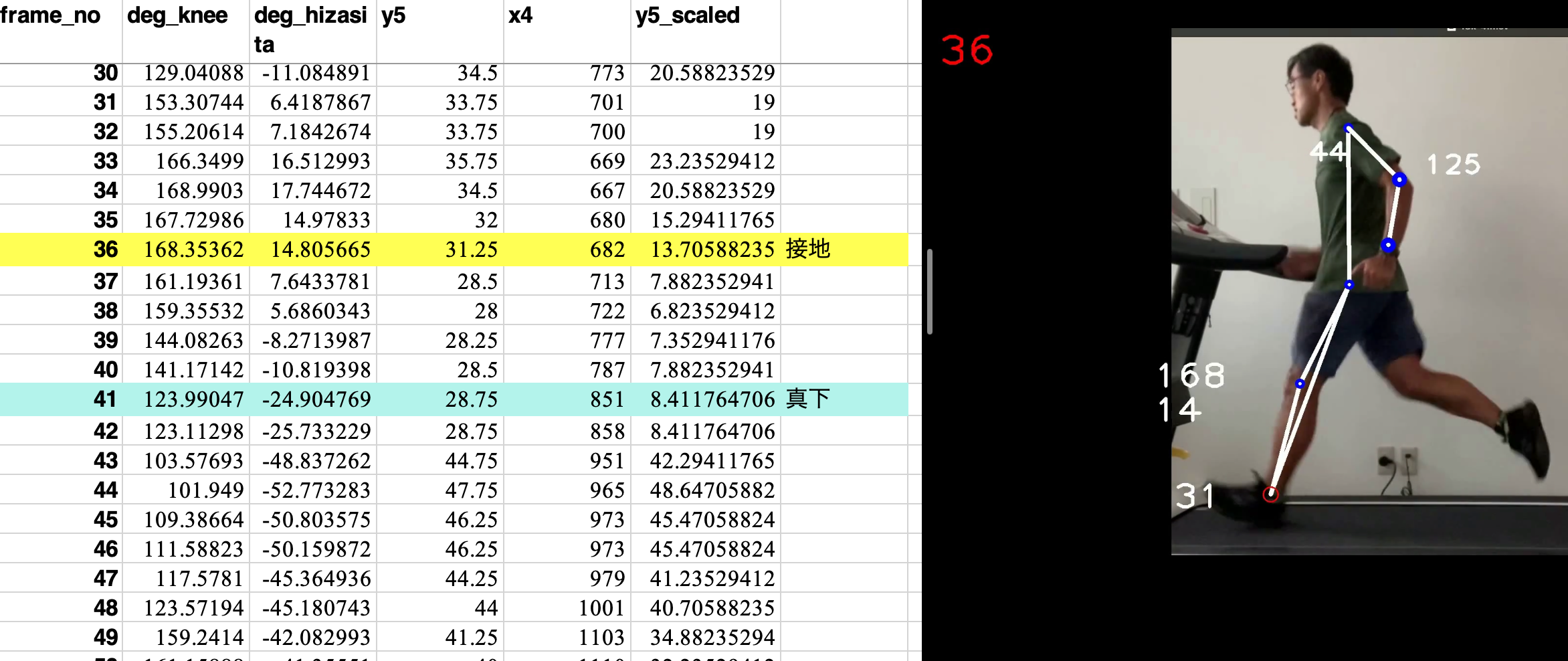 ランニング動画をAIによって骨格認識し、角度データ(肘・脇・膝・膝下)と足首の高さを取得。動画フレームごとのそれぞれのデータをCSV化してみた。