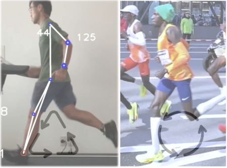 - (右)この時点での膝下角度は、ほぼ鉛直(0度)。自転車のペダル回転のように前方から掻くような動作。地面からの反発力を体幹で受け止め、体幹のバネを使って推進力に活かすことができる。